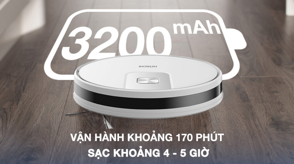 Hitachi RV-X15N sử dụng pin 3200 mAh cho thời gian hoạt động lên đến khoảng 170 phút. Thời gian sạc từ 4–5 giờ, phù hợp cho việc làm sạch toàn bộ căn hộ trong một lần sạc. Robot có khả năng tự nhận biết pin yếu và quay về đế sạc thông minh.