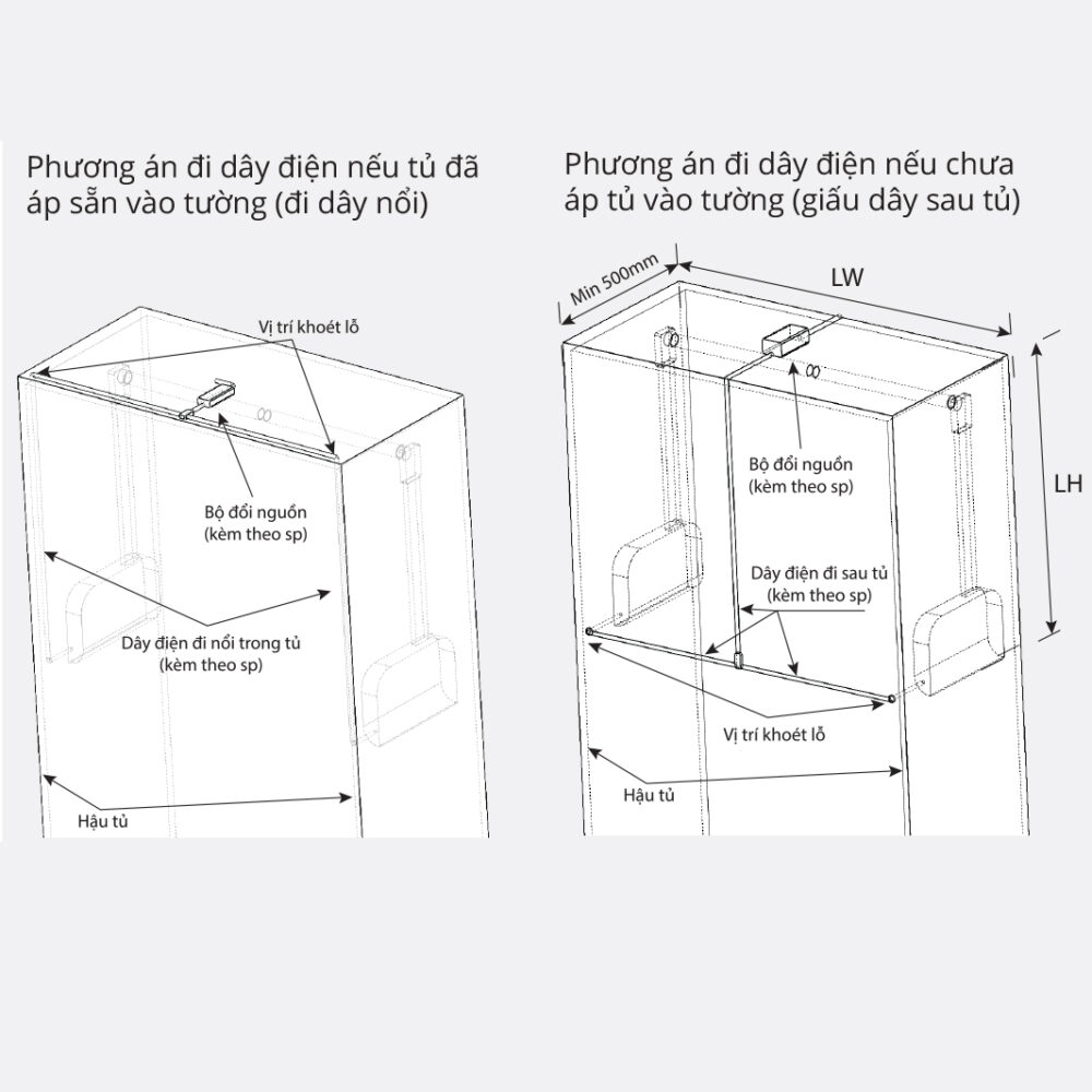 - Trang bị đèn LED chiếu sáng dọc thanh treo, giúp quan sát quần áo rõ ràng hơn, đặc biệt tiện lợi trong không gian tủ kín hoặc thiếu ánh sáng