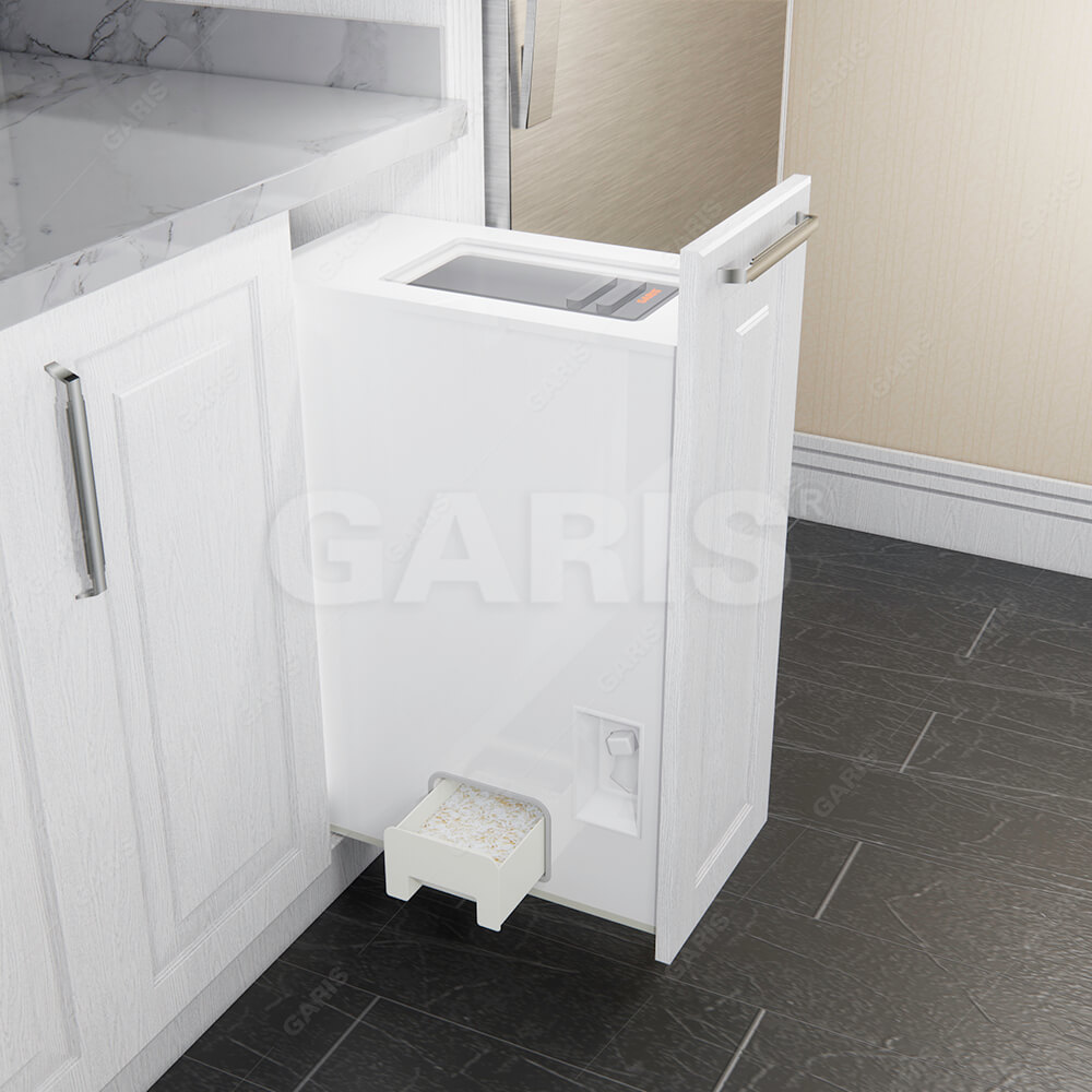 Thùng gạo Garis GR08.30 cánh kéo với thiết kế hiện đại, chất liệu nhựa cao cấp bảo quản gạo khỏi ẩm mốc và côn trùng. Với cách lấy gạo đặc biệt chỉ với nút nhấn một lượng gạo tương đương với 150g sẽ tự động được đẩy ra giúp những người nội trợ có thể dễ dàng tính toán số lượng vừa đủ cho cả gia đình. Sản phẩm nằm trong khoang tủ 300mm sử dụng cơ chế cánh tủ kéo, khi kéo cánh tủ ra bạn có thể nhìn thấy toàn bộ được thùng gạo, giúp cho và lấy gạo ra một cách dễ dàng.