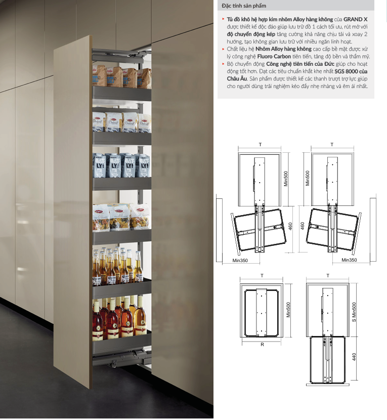 - Tủ đồ khô GrandX XPR.400T là lựa chọn lý tưởng cho những gia đình muốn tối ưu không gian bếp một cách khoa học và tiện lợi. Với thiết kế 6 tầng lưu trữ rộng rãi, sản phẩm cho phép sắp xếp đa dạng các loại thực phẩm, đồ khô và vật dụng nhà bếp. Điểm nổi bật là hệ chuyển động kép, giúp tủ có khả năng rút mở linh hoạt và xoay hai hướng, mang lại sự tiện lợi khi lấy đồ từ nhiều góc độ.