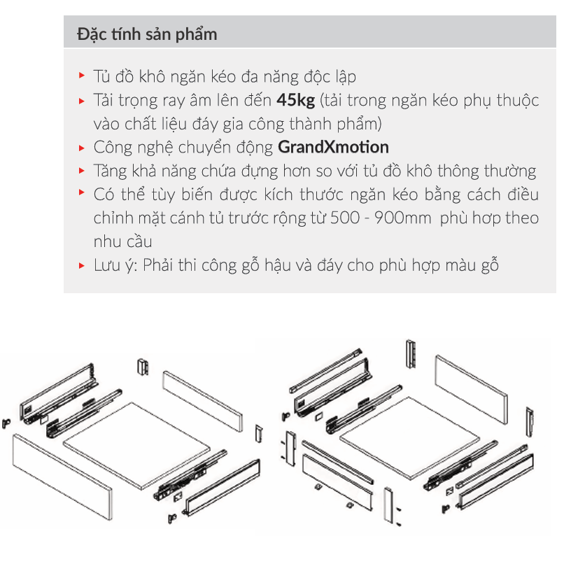 - Tải trọng lên đến 45kg – Ray âm chắc chắn, chịu lực tốt, đảm bảo lưu trữ an toàn.