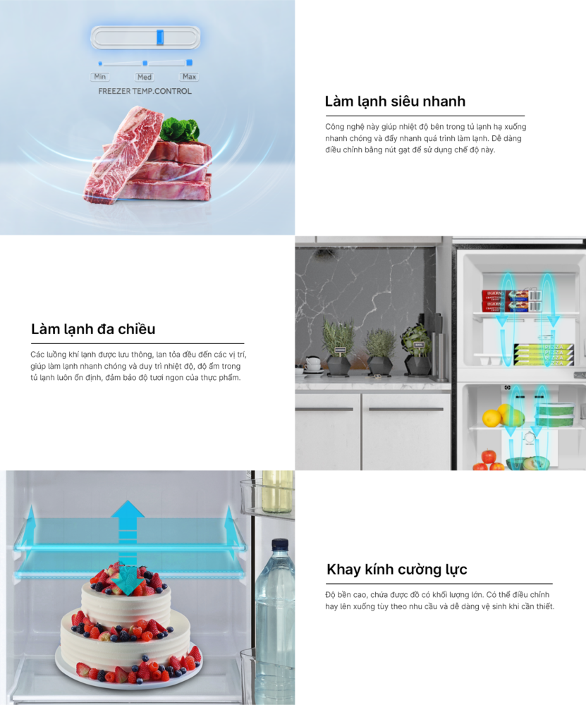 Tủ được trang bị công nghệ làm lạnh gián tiếp giúp hơi lạnh lan tỏa đều qua quạt gió. Nhờ đó, thực phẩm không bị đóng tuyết và duy trì độ tươi ngon ổn định. Người dùng cũng tiết kiệm thời gian vệ sinh tủ hơn trong quá trình sử dụng. - Làm lạnh đa chiều bảo quản thực phẩm đồng đều