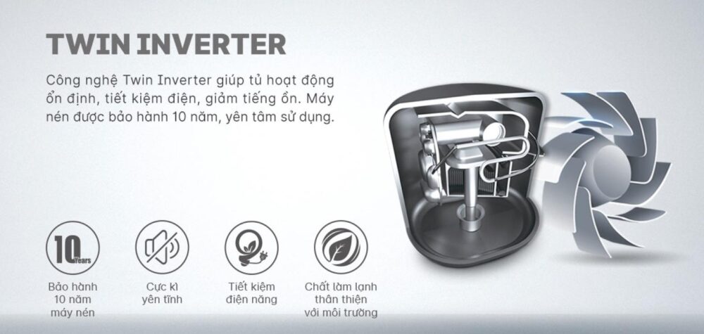- Sản phẩm được trang bị công nghệ Twin Inverter giúp tủ vận hành êm ái, ổn định và tiết kiệm điện năng hiệu quả. Máy nén có khả năng tự điều chỉnh công suất làm lạnh phù hợp với lượng thực phẩm bên trong. Nhờ đó, tủ vừa giảm chi phí điện hàng tháng vừa nâng cao độ bền trong quá trình sử dụng lâu dài.