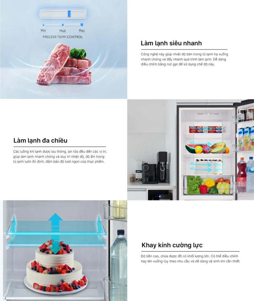 - Về khả năng bảo quản, sản phẩm nổi bật với ngăn đông mềm thế hệ mới -3°C cho phép bảo quản thịt cá tươi ngon mà không cần rã đông khi chế biến. Hệ thống làm lạnh đa chiều giúp khí lạnh lan tỏa đồng đều, hạn chế tình trạng thực phẩm bị khô héo. Công nghệ DEO Fresh hỗ trợ khử mùi và diệt khuẩn, giữ không gian tủ luôn sạch sẽ.