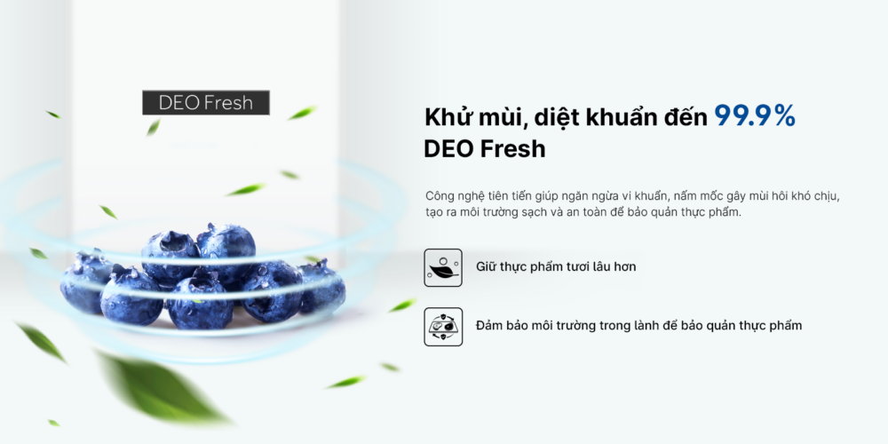 Công nghệ DEO Fresh với Nano bạc giúp loại bỏ mùi hôi khó chịu và ức chế sự phát triển của vi khuẩn. Không gian bên trong tủ luôn trong lành, sạch sẽ. Thực phẩm được bảo quản an toàn hơn cho sức khỏe gia đình.