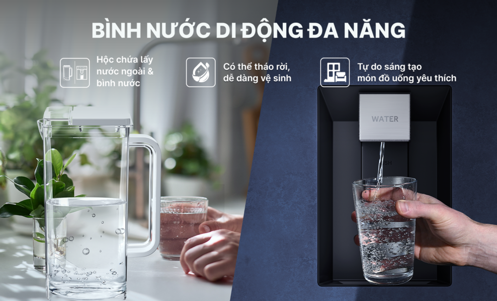 Tủ tích hợp khay lấy nước ngoài kèm bình nước có thể tháo rời. Người dùng có thể pha chế nước trái cây, trà rồi gắn lại vào tủ để làm lạnh. Thiết kế tiện lợi, dễ vệ sinh và phù hợp cho nhu cầu sử dụng thường xuyên.