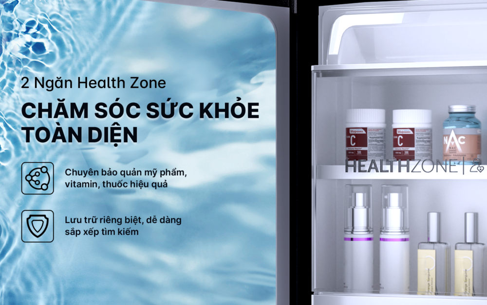 Hai ngăn Health Zone được thiết kế chuyên biệt để lưu trữ mỹ phẩm, vitamin và thuốc men. Việc tách biệt này giúp đảm bảo vệ sinh và duy trì điều kiện bảo quản ổn định cho các sản phẩm chăm sóc sức khỏe. Đây là điểm nổi bật phù hợp với lối sống hiện đại, quan tâm đến sức khỏe gia đình.