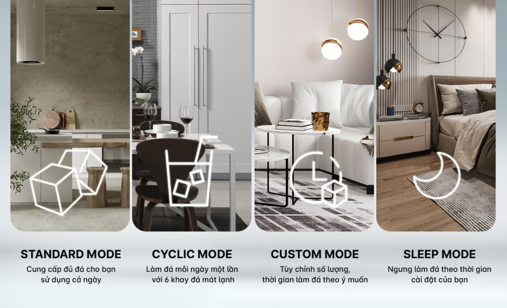 Sản phẩm hỗ trợ 4 chế độ làm đá gồm Standard, Cyclic, Custom và Sleep Mode. Mỗi chế độ được thiết kế phù hợp với từng thói quen sinh hoạt, từ sử dụng đá thường xuyên đến hạn chế tiếng ồn ban đêm. Sự linh hoạt này giúp tối ưu trải nghiệm và tiết kiệm năng lượng hiệu quả.