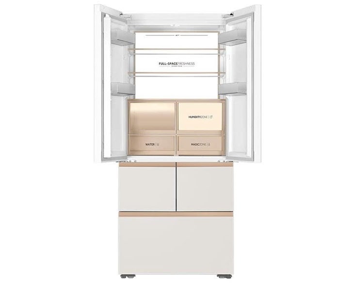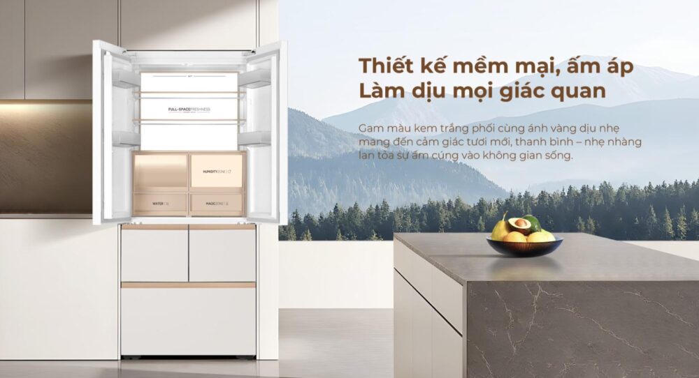 Tủ lạnh sở hữu gam màu kem trắng phối ánh vàng tinh tế, mang lại cảm giác sang trọng, nhẹ nhàng và hiện đại. Tổng thể thiết kế giúp không gian bếp trở nên thanh lịch và đồng bộ hơn. Sản phẩm dễ dàng phù hợp với nhiều phong cách nội thất cao cấp.