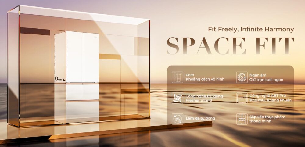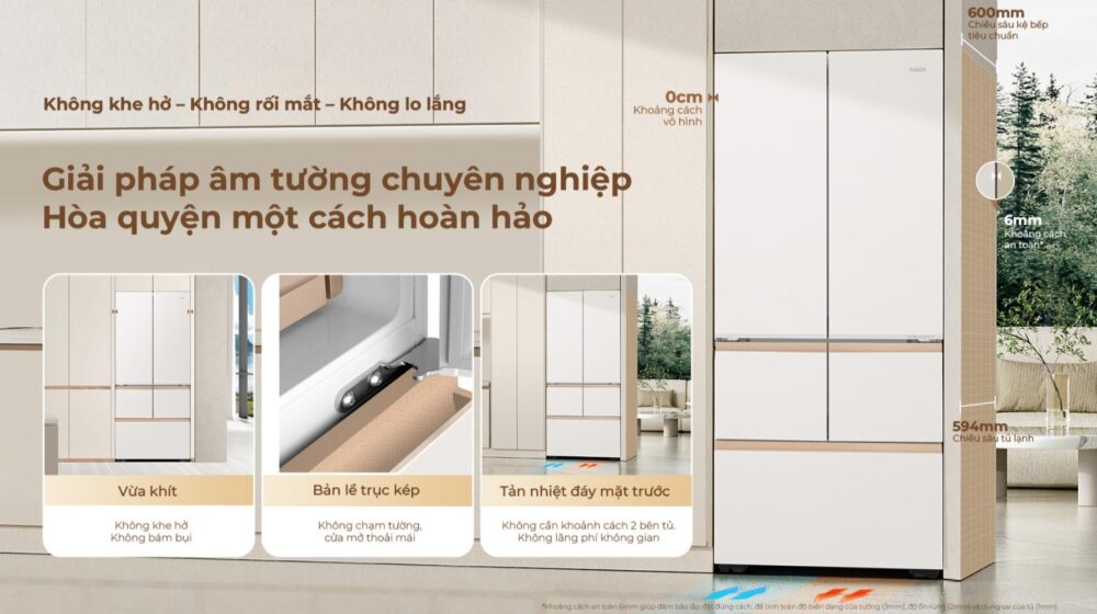 Thiết kế cho phép lắp đặt âm tường với khoảng cách vô hình 0 cm, kết hợp công nghệ tản nhiệt mặt trước hiện đại. Bản lề trục kép giúp cửa mở linh hoạt mà không chạm tường, hạn chế khe hở và bám bụi. Nhờ đó, không gian bếp luôn gọn gàng và liền mạch.