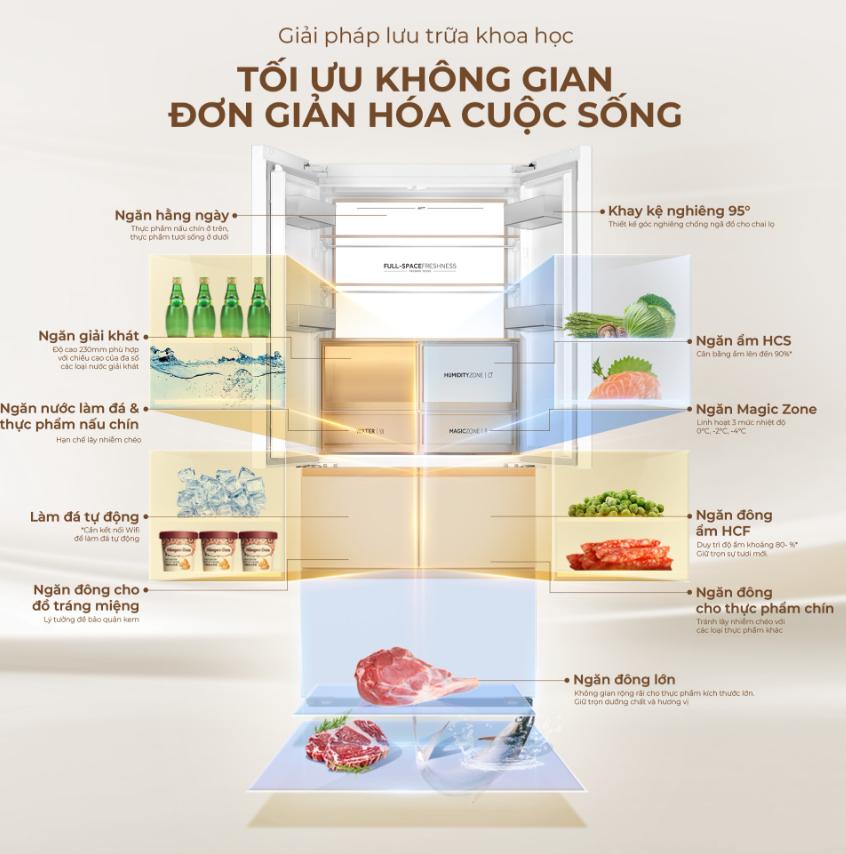 Không gian bên trong được chia thành nhiều khu vực chuyên biệt như: ngăn hàng ngày, ngăn giải khát, khay kệ nghiêng 95°, ngăn làm đá & thực phẩm chín, ngăn ẩm HCS, ngăn Magic Zone, ngăn đông HCF và ngăn đông lớn. Cách bố trí thông minh giúp sắp xếp thực phẩm gọn gàng, dễ lấy. Đồng thời tối ưu dung tích sử dụng cho gia đình đông người.