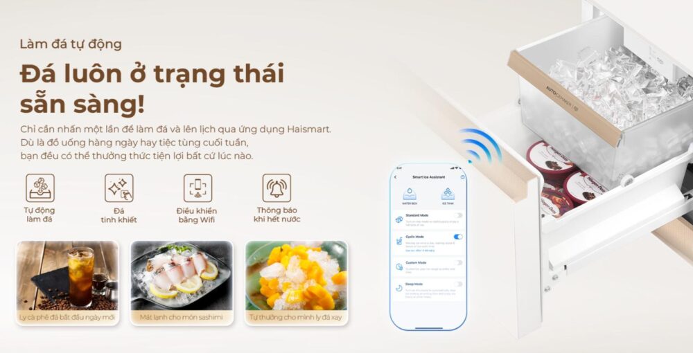 Tủ lạnh được trang bị tính năng làm đá tự động, luôn sẵn sàng sử dụng mỗi ngày. Người dùng có thể điều khiển, lên lịch làm đá và theo dõi trạng thái qua ứng dụng Haismart thông qua Wi-Fi. Ngoài ra còn có thông báo hết nước, mang đến trải nghiệm sử dụng tiện nghi và thông minh hơn.