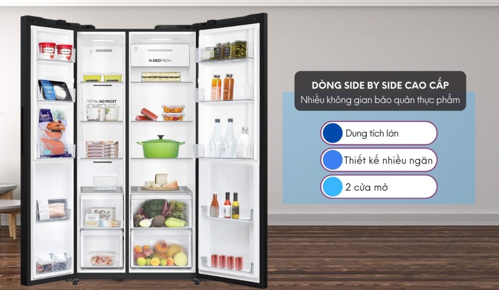 Tủ lạnh sở hữu thiết kế Side by Side cao cấp với tông màu đen thời thượng, dễ dàng phối hợp với nhiều không gian bếp. Bề mặt cửa hoàn thiện từ thép cao cấp giúp hạn chế trầy xước, tăng độ bền và nâng tầm thẩm mỹ tổng thể. Kiểu dáng tối giản nhưng mạnh mẽ mang lại cảm giác đẳng cấp cho không gian sống.