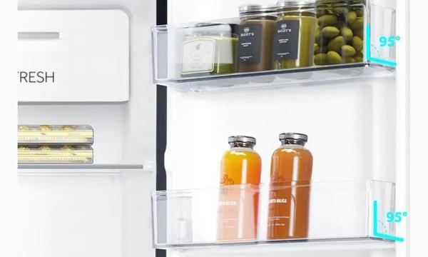 Thiết kế khay kệ cửa với góc nghiêng 95° giúp hạn chế tình trạng chai lọ bị rơi, đổ khi mở cửa mạnh. Chi tiết nhỏ nhưng mang lại sự an tâm và tiện lợi trong quá trình sử dụng hằng ngày. Đây là điểm cộng được nhiều người dùng đánh giá cao.