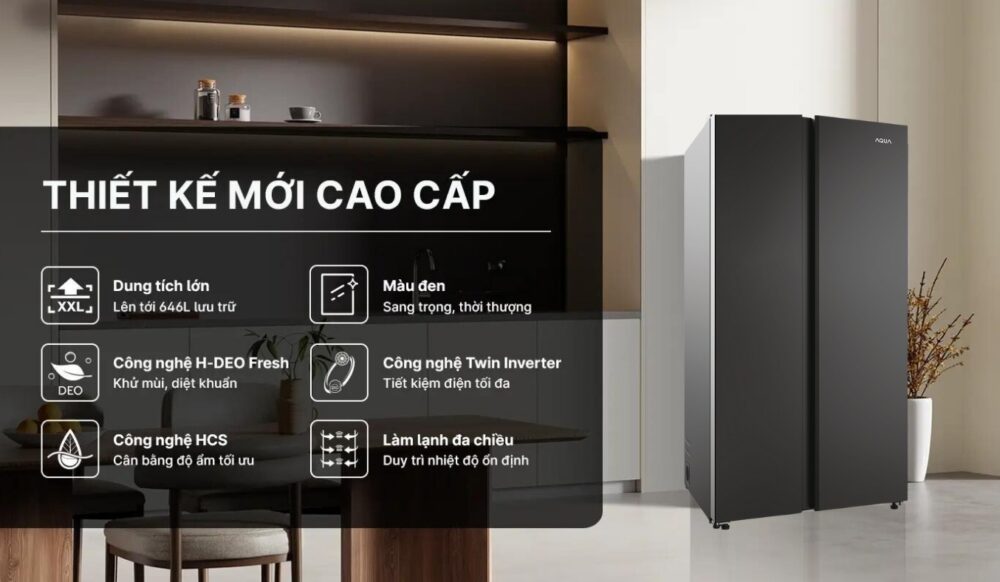 - Tủ lạnh Aqua Inverter 646 lít AQR-S682XA(BL) gây ấn tượng với thiết kế Side by Side hiện đại, gam màu đen sang trọng và bề mặt thép cao cấp bền bỉ. Kiểu dáng lớn, đường nét tối giản giúp sản phẩm dễ dàng hòa hợp với nhiều không gian bếp, đồng thời tạo cảm giác cao cấp và gọn gàng khi sử dụng hằng ngày.