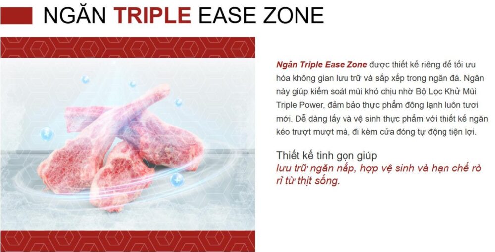 Ngăn kháng khuẩn Triple Ease Zone kết hợp bộ lọc Triple Power giúp loại bỏ vi khuẩn và mùi khó chịu hiệu quả. Không khí bên trong tủ luôn sạch sẽ, hạn chế lẫn mùi giữa các loại thực phẩm. Đảm bảo môi trường bảo quản an toàn cho cả gia đình.