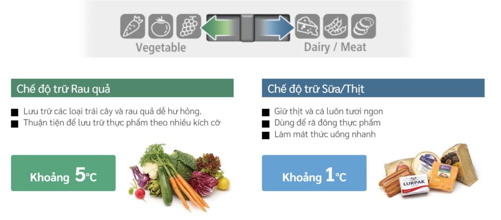 - Ngăn Fresh Select linh hoạt: Ngăn Fresh Select cho phép điều chỉnh nhiệt độ theo loại thực phẩm như rau củ, thịt hay sữa. Chỉ cần gạt thanh chuyển đổi là tạo được môi trường lý tưởng. Thực phẩm luôn giữ được độ tươi ngon và dưỡng chất.