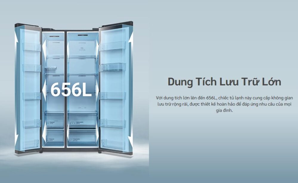 - Tủ lạnh Hitachi Inverter 656 lít HRSN9713ESMGWVN gây ấn tượng với thiết kế side by side hiện đại, mặt kính trắng nhám sang trọng, phù hợp không gian bếp cao cấp. Dung tích lớn 656 lít đáp ứng tốt nhu cầu lưu trữ thực phẩm cho gia đình đông người hoặc gia đình có thói quen tích trữ nhiều. Các đường nét tinh tế kết hợp bảng điều khiển cảm ứng giúp tổng thể vừa thẩm mỹ vừa tiện dụng.