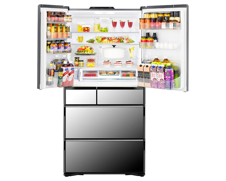 - Tủ lạnh Hitachi Inverter 735 lít R-ZX740KV(X) sở hữu thiết kế Multi Door 6 cánh cao cấp với bề mặt gương pha lê sang trọng, tạo điểm nhấn nổi bật cho không gian bếp hiện đại. Kiểu dáng tinh tế kết hợp dung tích lớn 735 lít giúp đáp ứng tốt nhu cầu lưu trữ thực phẩm của gia đình đông người, đồng thời tối ưu khả năng sắp xếp khoa học.